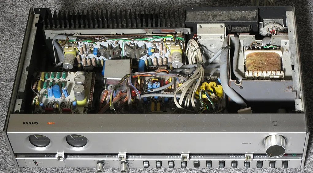 O 521, entretanto, é totalmente transistorizado classe AB. São 32 transistores, e um belo dissipador que toma dois terços do painel traseiro – já que ele esquenta bastante. Inclusive é normal o aparelho estar desregulado e esquentar demais, principalmente em países ou regiões muito quentes. Os aparelhos que vieram ao Brasil, assim como para várias regiões do mundo, vinham escrito “Made in Holland” e “Tropicalized”. Aliás, não consegui descobrir exatamente o que foi ‘tropicalizado’ no aparelho, mas eu acredito ser a adequação às variações de voltagem locais (têm lugares do mundo que são 110V e no Brasil é mais comum o 127V, por exemplo, além de haver diferenças entre 50Hz e 60Hz), assim como regulagem específica da corrente de bias – para não esquentar demais em países muito quentes. Tanto que existem aparelhos desses escrito “Tropicalized” em vários lugares do mundo, não só no Brasil.