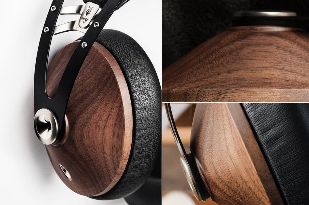 Totalmente fechados, eles pesam menos de 300 gramas (fato que adorei), e são acabados em madeira (nogueira). Os fixadores são de zinco fundido e a estrutura é toda de aço manganês estampado, com mola e tiara ajustável de couro sintético.