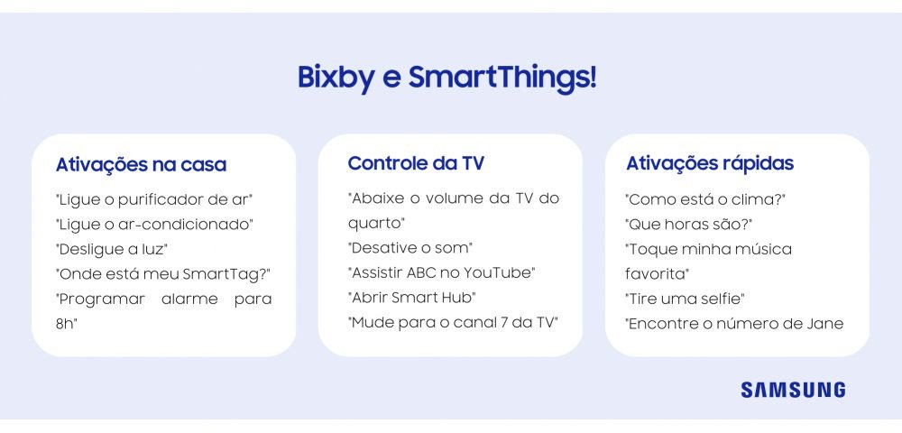 Com a incorporação do ecossistema Samsung pelo SmartThings, aplicativo da marca criado especialmente para o gerenciamento e controle de vários dispositivos que tenham a tecnologia Smart, a assistente de voz possibilita a gestão de uma casa conectada, por meio da otimização dos dispositivos domésticos. Assim, tarefas como ajustar a temperatura no ambiente, ligar um eletrodoméstico ou configurar aparelhos se tornam ainda mais simples.
