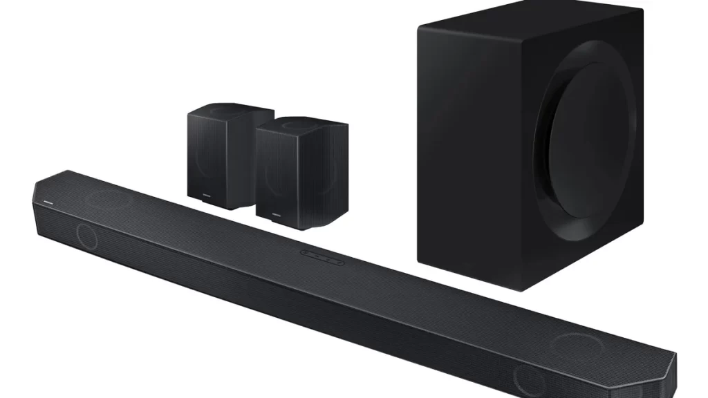 A Samsung também apresentou duas novas soundbars: a HW-Q990D, que permite a passagem de sinal de vídeo 4K a 120Hz, e usa IA para aprimoramento do som.
