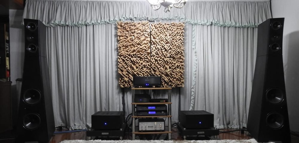 A sua sala possui excelentes medidas, bem larga e com excelente profundidade – acredito que tenha aproximadamente uns 40 metros quadrados ou mais. Tratamento acústico com apenas um par de difusores da Hi-Fi Experience, elétrica dedicada com cabo PowerClean e chave seccionadora Siemens, dois pares de TubeTrap nos cantos da sala atrás das caixas e um rack dedicado.