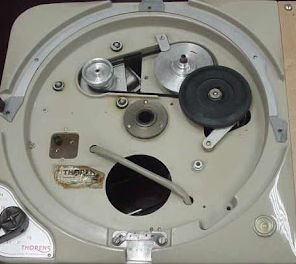 Existe também um caso – que eu me lembre, único toca-discos originalmente projetado dessa maneira – que é o do Thorens TD124 (lançado em 1957 e que, até hoje, em bom estado e com um braço bom, é um excelente toca-discos), que usa uma tração híbrida: a polia, em vez de ser acionada pressionando-a contra o motor, sua rotação é obtida através de uma correia de borracha ligada ao motor. E, claro, para acionar o prato, essa polia, que é presa em uma suporte com uma mola, é pressionada contra a borda do prato (esta última parte como em qualquer tração por polia). Esse sistema um tanto ‘complicador’, parece ser de menor vibração e ruído que a polia sozinha.