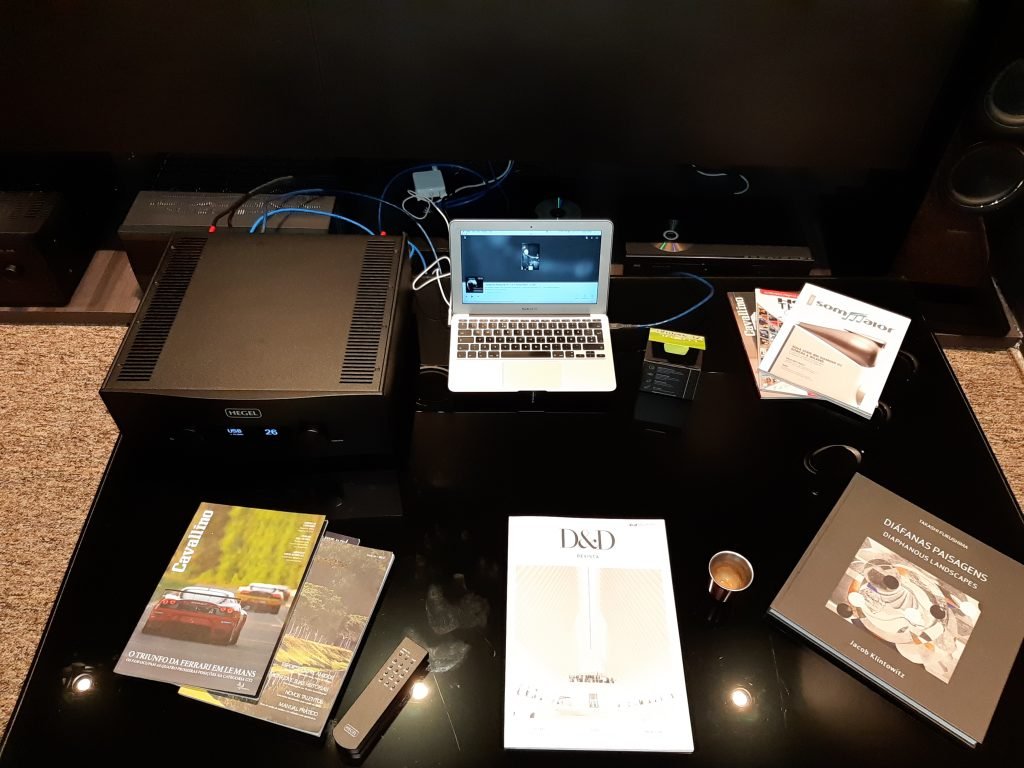 Para acompanhar o integrado na demonstração foram utilizadas caixas acústica B&W 702S2. A sala de audição é utilizada principalmente para apresentações de home-theater, mas ainda assim foi possível ter uma idéia do poder de fogo do Hegel H590, principalmente quando, no final da última apresentação, alguns convidados já haviam saído da sala e foi trocado o H590 pelo H90: o som murchou por completo! Nas condições em que estava o H590, muito mais favoráveis ao H90 que ao primeiro, fiquei a pensar que sim, este é mais um baita integrado que vale muito a pena ser ouvido!