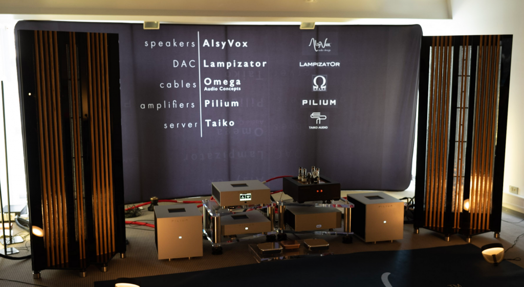 Dizem alguns audiófilos que painéis não reproduzem bons graves. Tipicamente, as salas não são grandes o bastante, comparadas ao comprimento de onda dos sons mais graves. Como painéis são dipolos, parte dos graves irradiados para trás se mistura e cancela com os projetados à frente, num fenômeno acústico bem conhecido. Então deve-se ouvir painéis longe de paredes, ou trabalhar para minimizar a interferência. Os painéis Raffaello da espanhola Alsyvox vão na segunda opção, e afastam preconceitos. A sala deles estava com som de primeira linha, dinâmico, envolvente, com peso e graves surpreendentes, mantendo médios e agudos limpos. Um dos truques é o sistema de crossovers externos, altamente customizado. Outro diferencial é a combinação de ribbons em diferentes posições do painel. A amplificação Pilium, o servidor Taiko e o DAC Lampizator estavam excelentes, e o conjunto brilhou, com cabos da Omega.