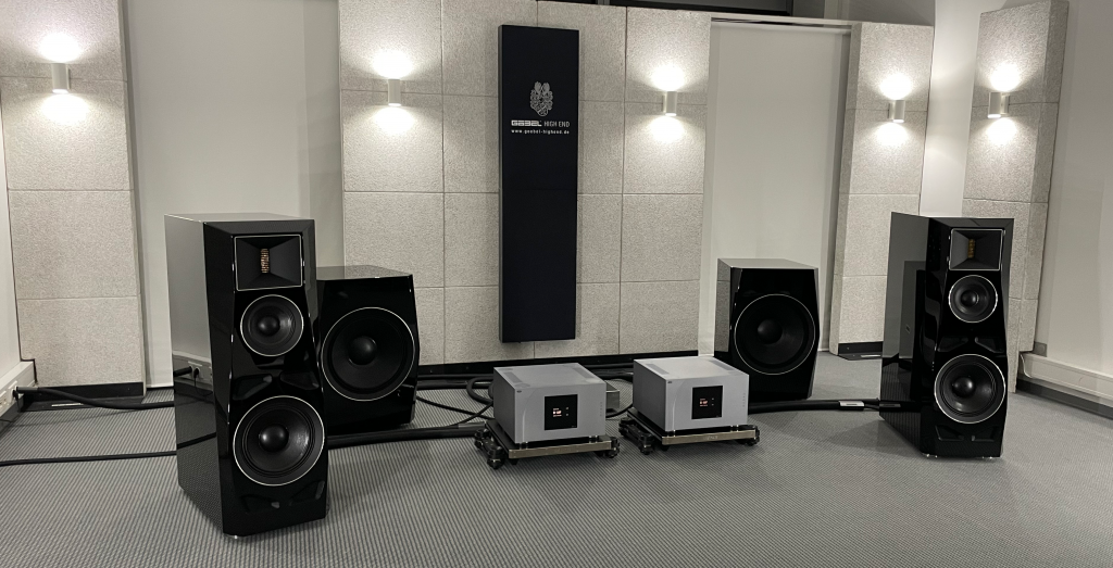 A alemã Göbel impressionou com um par de caixas Divin Marquis, empregando tweeter AMT em corneta de alumínio, além do médio 8” e woofer 12”, mais um par de subwoofers Divin Sovereign e seus cabos Lacorde Statement, alimentados por CH Precision, pré L1+X1 e um par de powers M10. O som estava grande, mas natural e relaxado, ao contrário do que se imagina de uma configuração tão grande. Um conjunto Wadax Reference com servidor, DAC, power supplies e condicionadores GigaWatt ocupava dois racks. Já o toca-discos Kronos Discovery, com o sistema de dois pratos girando em sentidos opostos, tinha seu novo modelo de braço, cápsula ZYX e ocupava outro rack inteiro. O pré de phono Kronos usa duas fontes com supercapacitores que se alternam em recarga, mantendo a operação desconectada da rede.