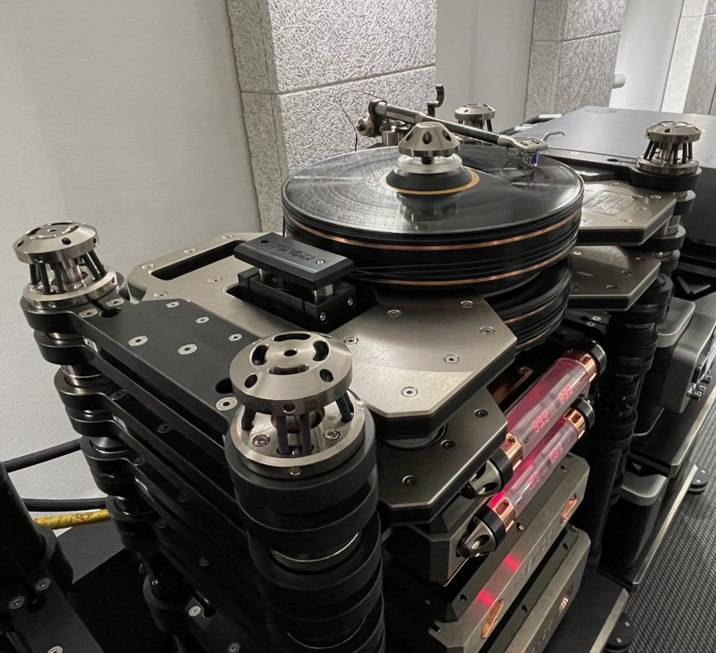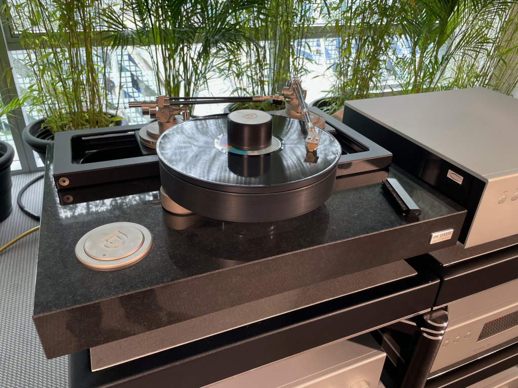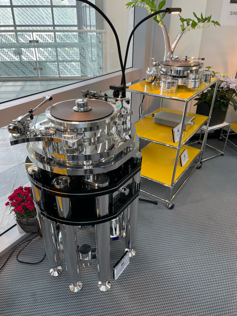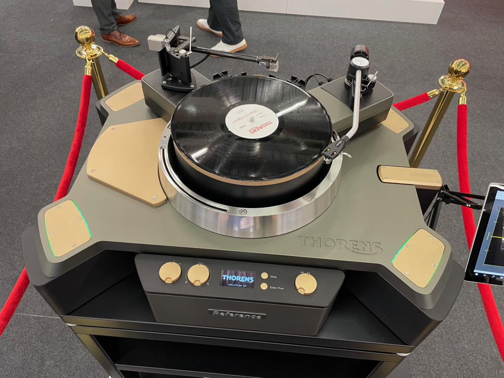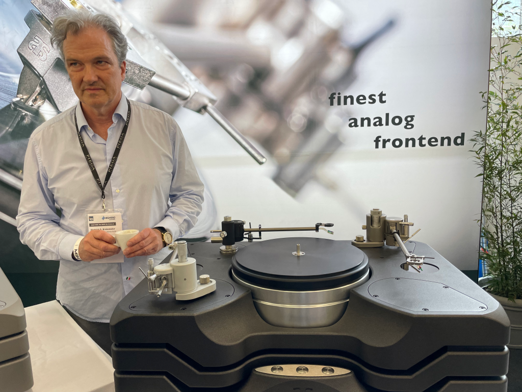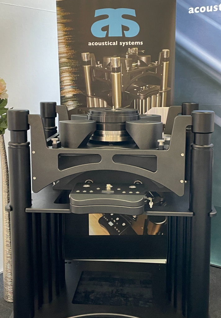 Falando em inovações, há de todos os tipos. Uma delas é o acoplamento de massas, formando complexos toca-discos pesados. Dietrich Brakemeier da AS Acoustical Solutions estava mostrando seus gigantescos modelos multicamadas e de bases aerostáticas, Astellar e Apolyt, além dos sofisticados braços Axiom, Titan e Aquilar, que fabrica. Em paralelo, a Thorens mostrou seu modelo Reference, outro gigante, com base ativa da Seismion.