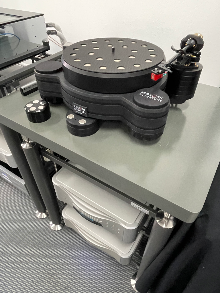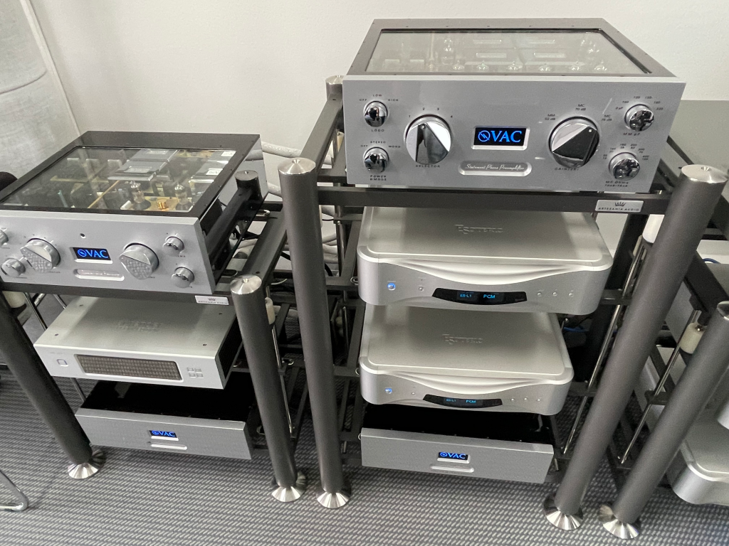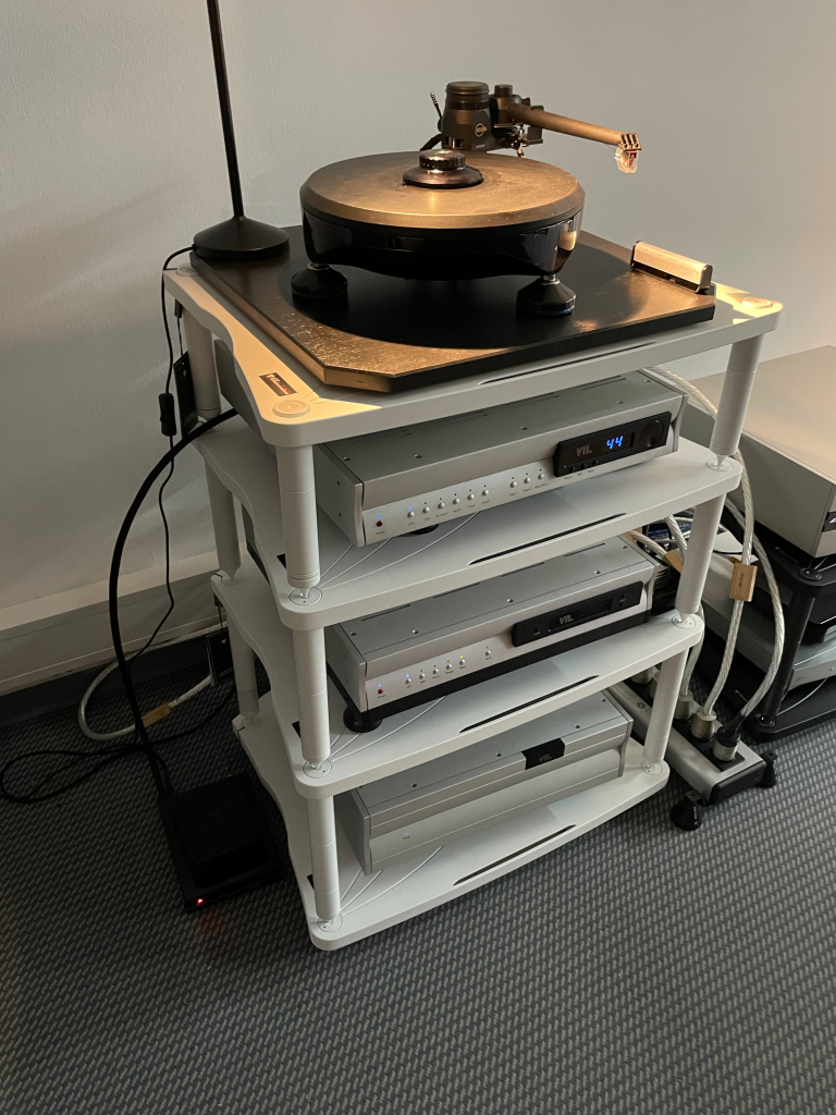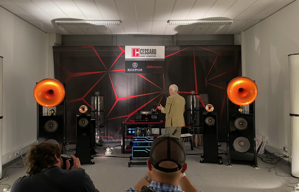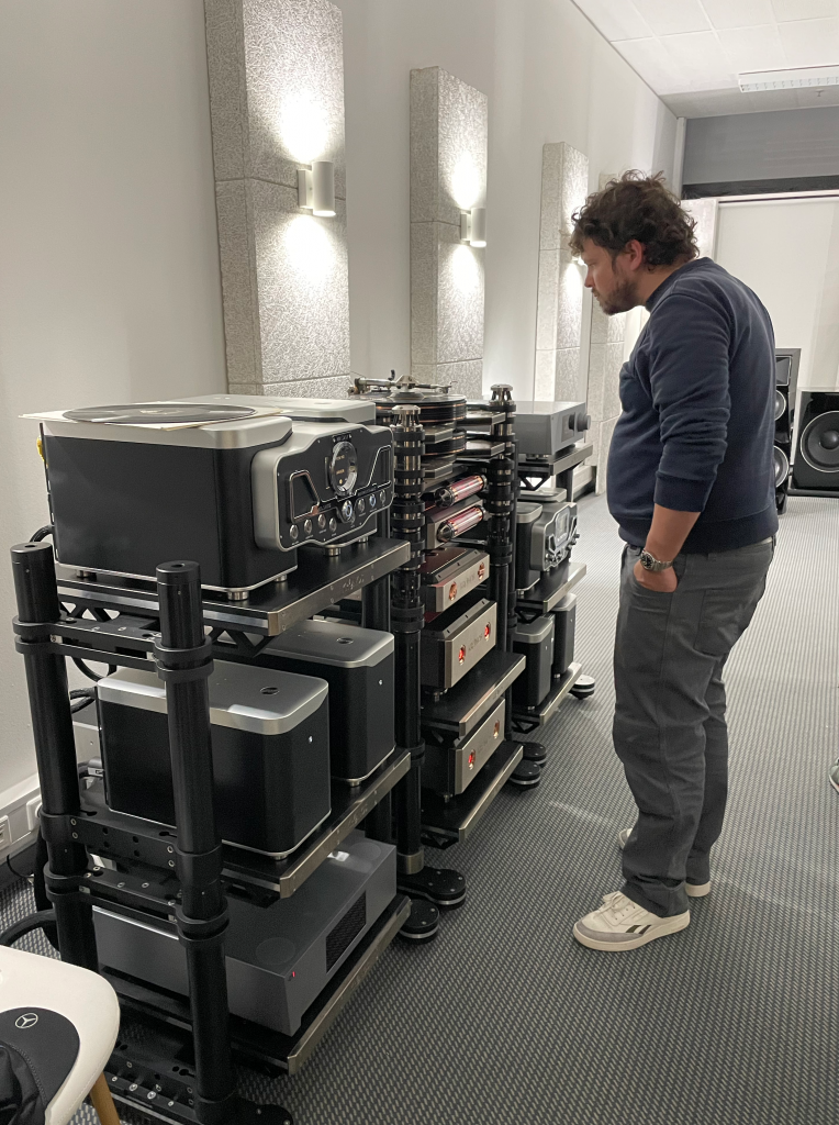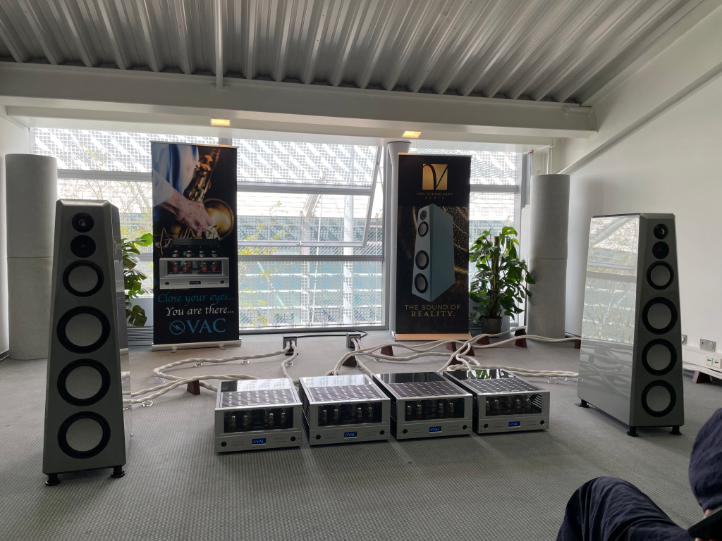 Escutamos as caixas Von Schweikert Ultra 7 associadas a dois pares de monoblocos VAC Master 300 iQ, prés Statement Line e Statement Phono, streamer Aurender, DACs Esoteric e toca-discos Acoustic Signature Typhoon com cápsula Hana Umami Red. Em digital também o som estava com ótimo palco, profundidade e boas texturas, mesmo com as paredes, janelas e teto sem revestimentos. Foram inteligentes em colocarem o sistema à frente, deixando amplo espaço por trás dos falantes e posicionando a platéia mais recuada.