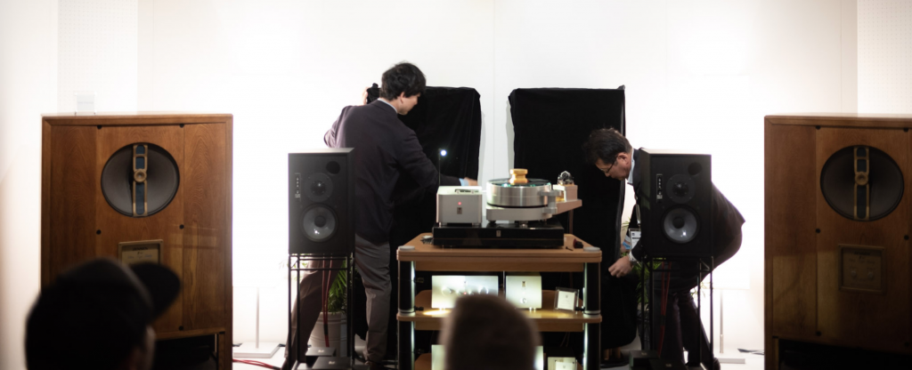 A japonesa Kondo é um paradigma de excelência artesanal, focada em elementos de pré e amplificação à válvula, clássicos ou modernizados, mas de altíssimo desempenho e custos correspondentes. Montaram uma sala usando caixas Jensen G-610C, dos anos 50, ou monitores Graham BBC LS 5/9. Também demonstravam ao vivo os tratamentos acústicos feitos em madeira por Nihon Onkyo Engineering (não é a Onkyo dos receivers). O pessoal colocava e retirava panos pretos sobre os difusores Acoustic Grove, um par em cada uma das 3 dimensões da sala, com o mesmo disco tocando. O público podia perceber as melhorias em tempo real. Muito bacana essa demonstração. O jazz big band estava um dos melhores sons do show, macio e quente, mas super detalhado em todas as frequências – não dava vontade de ir embora. Era toca-discos Kondo Ginga, braço SME V12, cápsula Audio Note IO-XP, phono GE-7i, pré G-700i e monoblocos Kagura 2i de 50W com válvulas 211. Não levaram som digital.