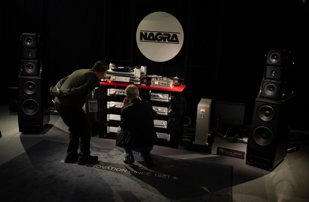 As marcas suíças de eletrônicos e caixas demonstravam som de fontes analógicas e a darTZeel lançou cápsulas high-end FS01 preta e FS02 vermelha, com cantilevers em diamante ou rubi e agulhas de perfil quadrado, buscando copiar o formato do diamante de corte na fabricação dos discos. Montadas em toca-discos da japonesa CSPort, braços Reed 3P, Schröder LT ou CSPort tangencial, as cápsulas produzem menos de 0,1 mV, mas o sinal é bem resolvido pelo alto ganho e baixo ruído dos prés NHB-18NS. Com os poderosos monoblocos NHB-468 e cabos Hemingway Audio, o som das caixas Stenheim Ultime Two estava vigoroso e emocionante. A parceira ANA Mighty Sound mostrou competência nos ajustes de phono e levou ampla coleção de vinil, em vários estilos musicais e complexidades sonoras, saindo do típico repertório limitado de alguns expositores. Havia também um gravador de rolo Metaxas Tourbillon T-RX, mas não pudemos estar nessa demonstração.