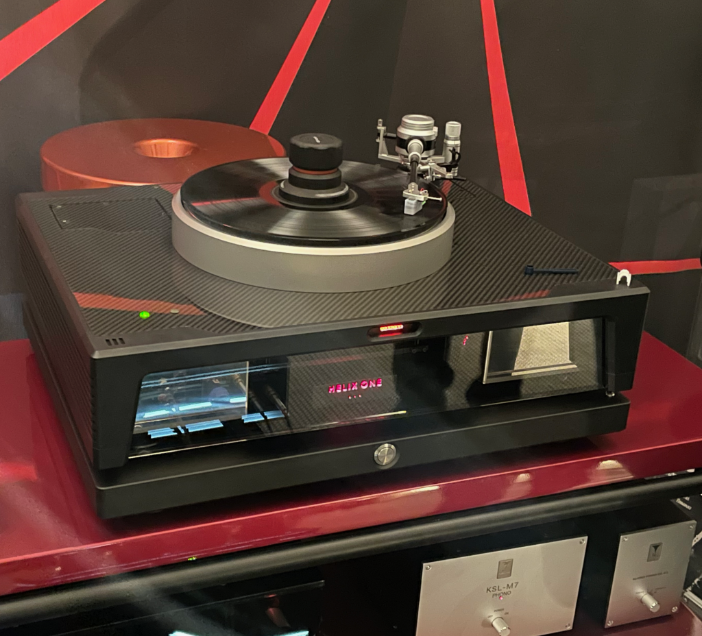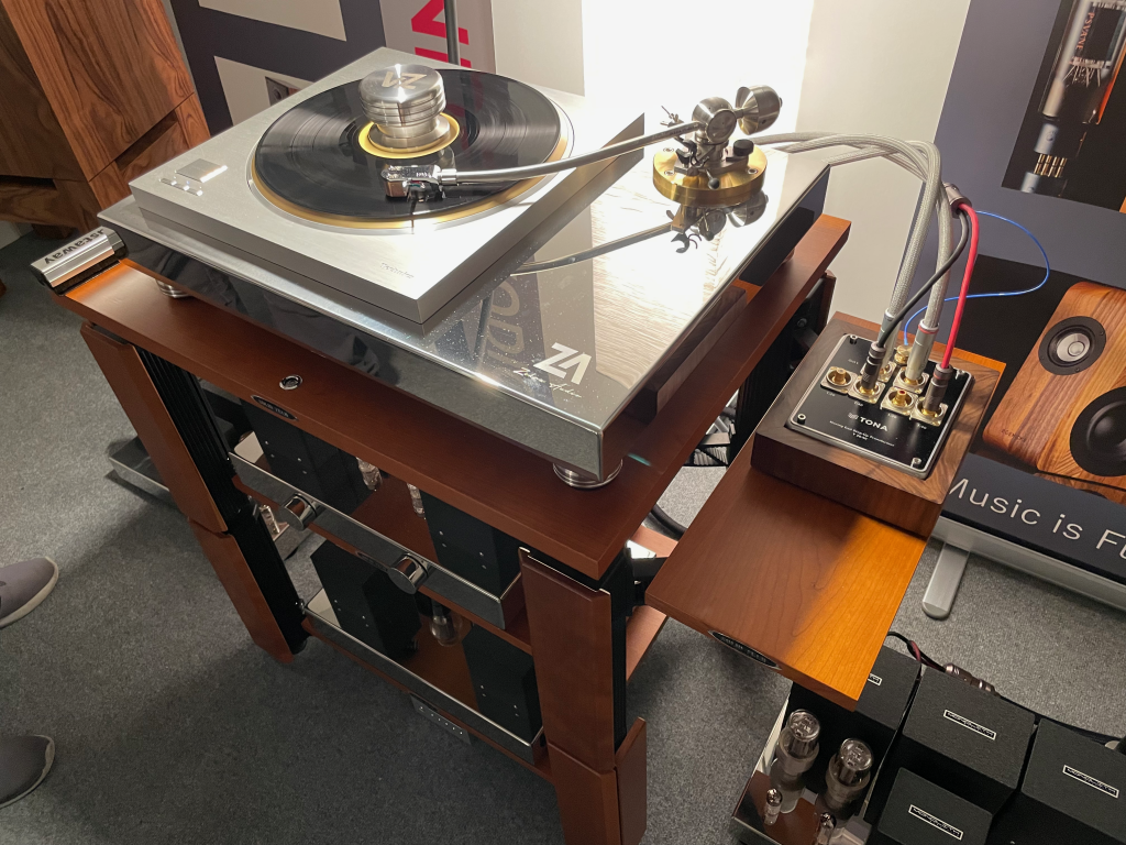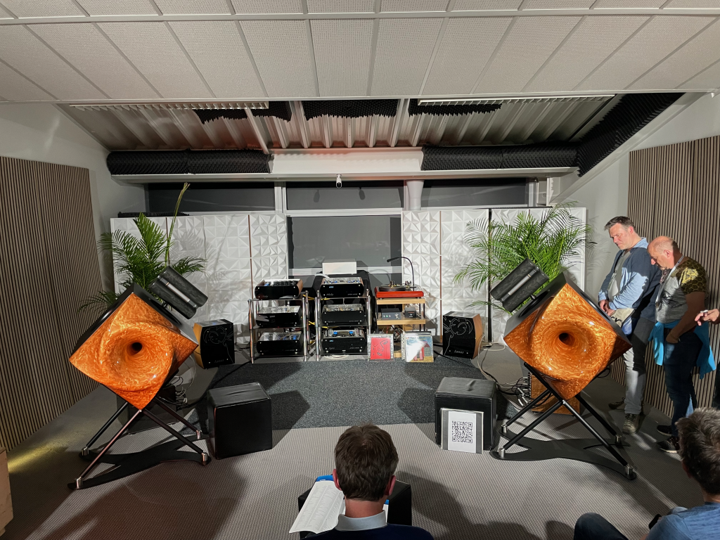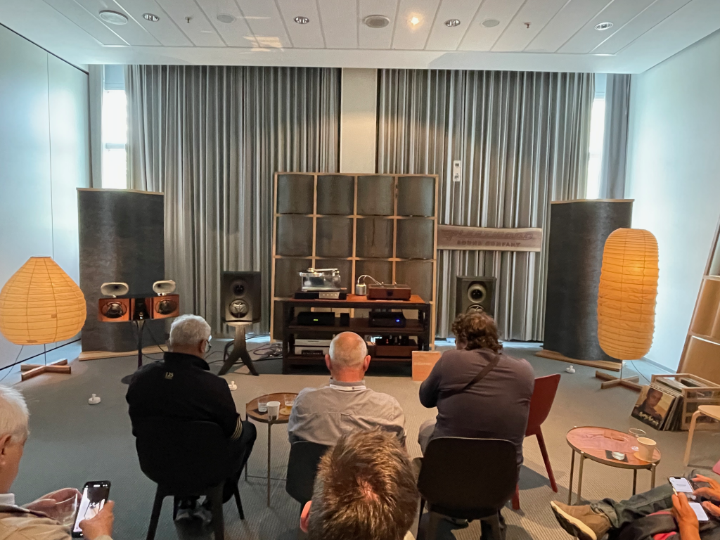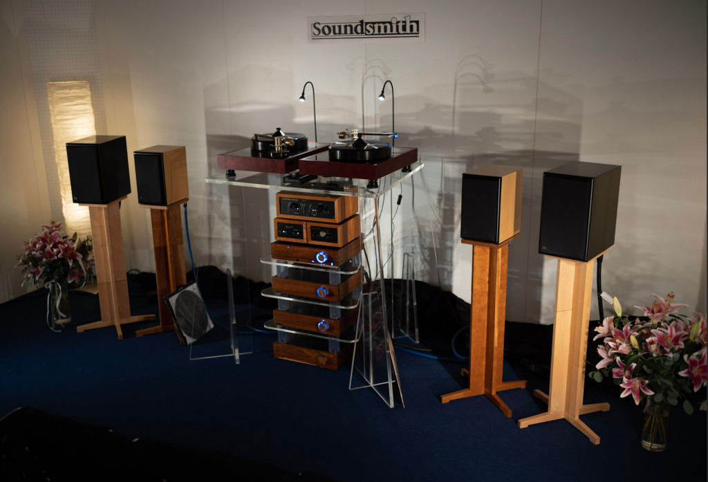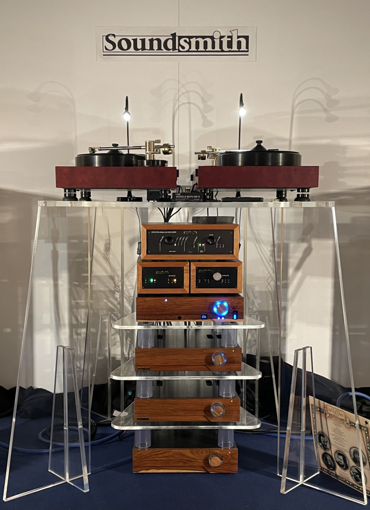 No meio de uma das áreas de stands no térreo, a Soundsmith montou sua sala com dry walls, onde expôs dois sistemas completos no mesmo espaço, um com a nova cápsula Hyperion ES MR, substituindo o diamante OCL por MR, e conseguiu reduzir sua massa móvel mais um pouco. Ao lado estava o sistema baseado na cápsula Strain Gauge, com seu preamplificador dedicado. Ambas as cápsulas estavam montadas em braços Schröder Referenz SQ 10” idênticos sobre dois toca-discos de tração direta Motus STST, cadeias de amplificação Soundsmith e opção entre Dragonfly e Monarch, os dois modelos de caixas fabricados pela Soundsmith. O som foi o melhor que ouvimos nas salas médias e pequenas, musicalmente expressivo, texturas palpáveis, ótima dinâmica e nenhuma fadiga auditiva. Podia-se ficar lá por horas, até pela hospitalidade de Peter Ledermann, mas havia muitos outros stands para visitarmos.