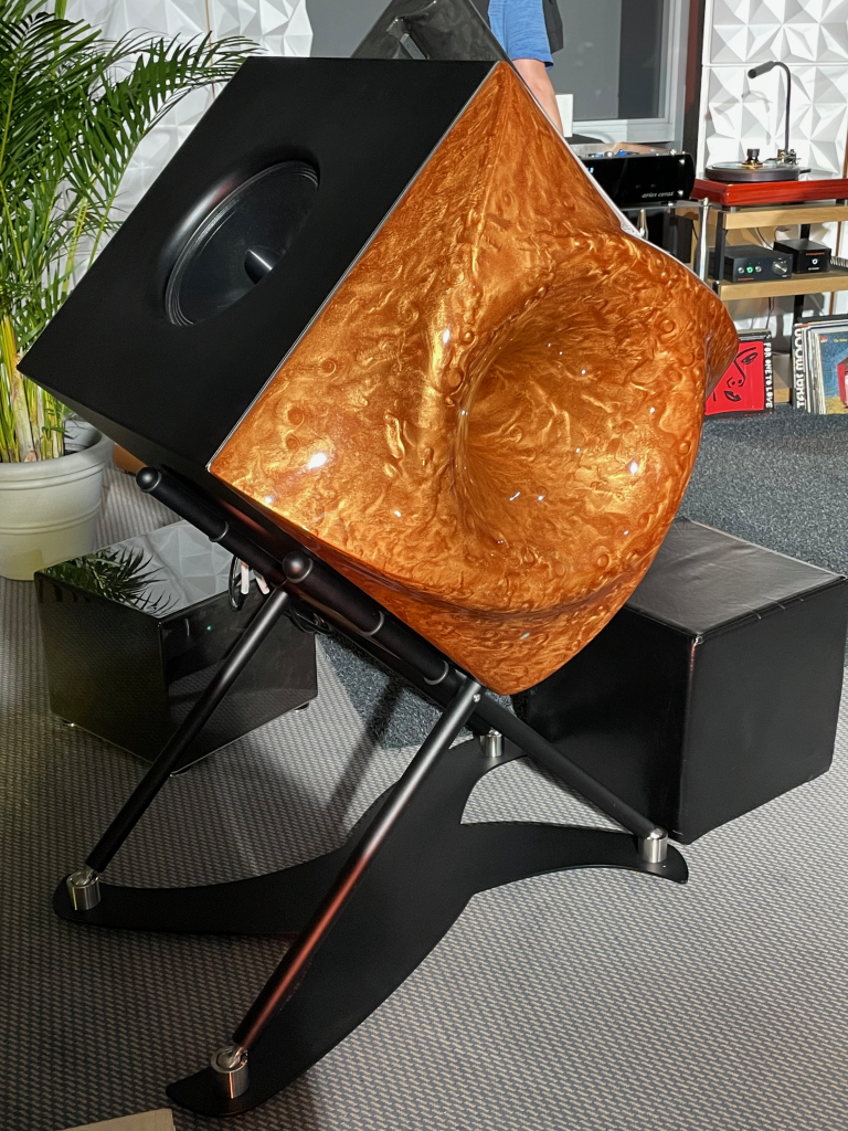 As caixas Aurora são tão intrigantes e atraentes, que o visitante leva um tempo até perceber que são cornetas de cone moldado, com quatro woofers em volta, num cubo open-baffle, mais um tweeter ribbon instalado a 45 graus, parecendo um filhote agarrado à mãe. A pintura em tom cobre perolado remete à origem cipriota da marca, lembrando que a ilha de Chipre foi a principal fornecedora de cobre ao império romano. O resto do sistema também é Aries Cerat, modelos Talos Signature, Ageto, Ithaka e powers Quintessence, exceto o toca-discos Primary Control Kinea com cápsula Lyra Atlas Lambda, o servidor digital Taiko Extreme e cabos Signal Projects. A eletrônica usa vários circuitos híbridos de válvulas e FETs, regulações à válvula, acoplamento por transformadores, designs proprietários de ‘inverted triodes’ e construção caprichada. De som grande, articulado e dinâmico, surpreende muito além do visual exótico.