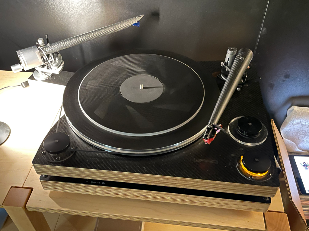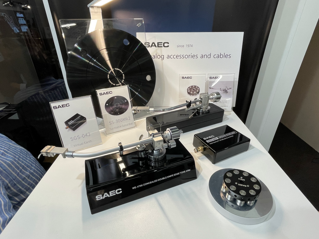 A japonesa SAEC relançou componentes clássicos dos anos 70 e 80, como o braço 407/23, o aluminum mat e a base de alumínio maciço, opções para o toca-discos Technics SP-10R. Também criou um braço sob encomenda para o novo Luxman PD-191A, de tração direta, que reedita a linha 171. Na outra foto com braço Ikeda 407 de 12” sobre base Zikra Audio e MC step up transformer dinamarquês TONA T20/40, montado num bloco de madeira maciça.