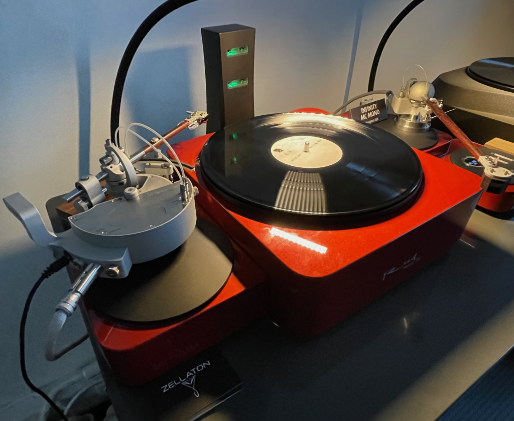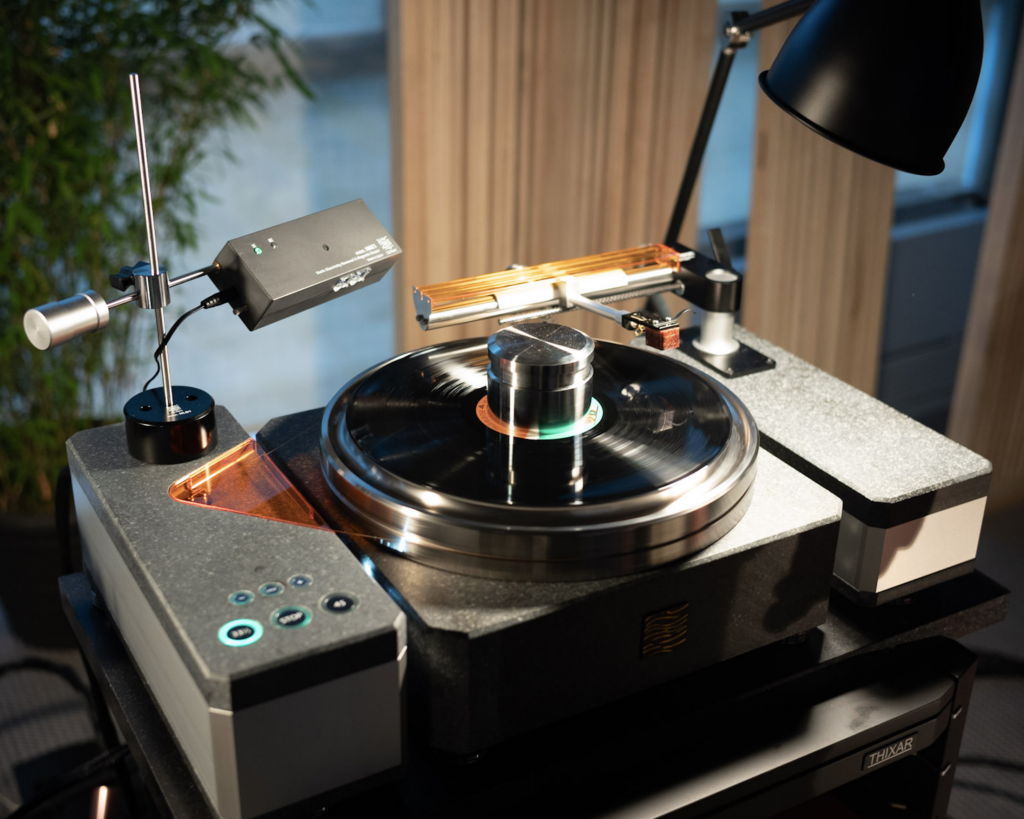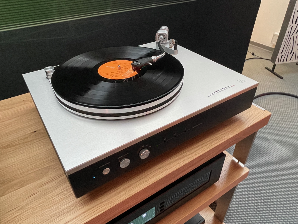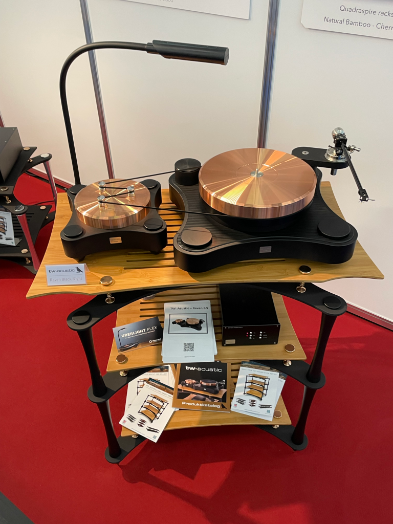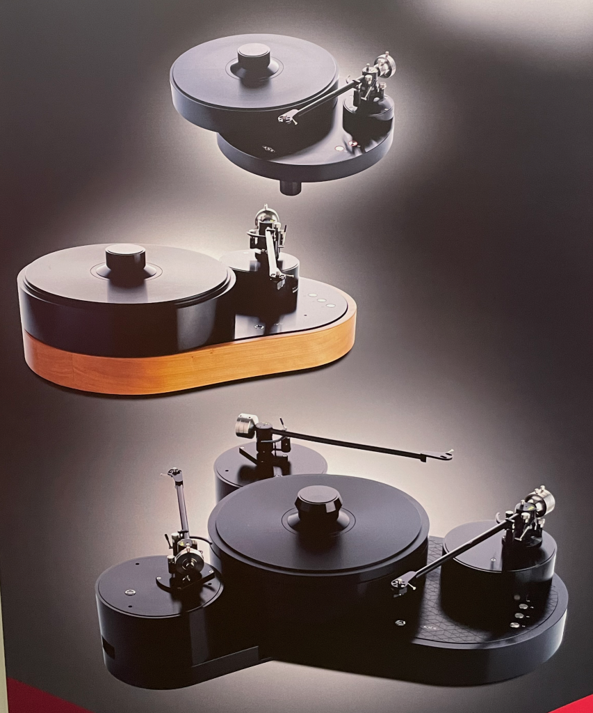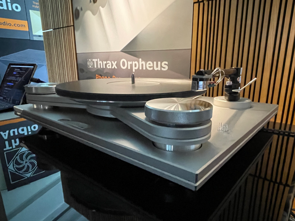 Da Bulgária vem o Thrax Orpheus, com braço Schröder CB, ocupando pouco espaço e tocando exemplarmente com cápsula MySonicLab. Outra linha de qualidade é a Dr Feickert, com modelos muito bons e versáteis. Uma novidade interessante foi escutar o neozelandês The Wand com braços próprios em fibra de carbono e design inovador. O som é ótimo.