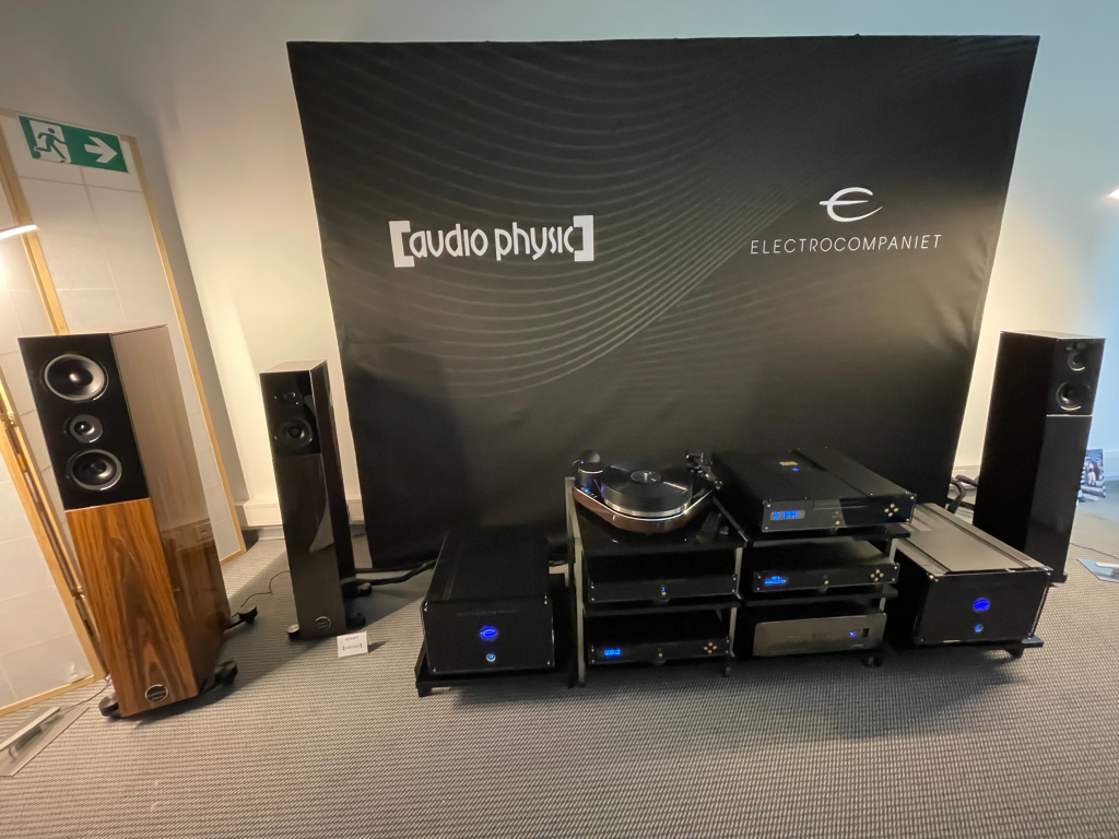 A fabricante alemã Audio Physic mostrou suas caixas premium Avantera, em parceria com os eletrônicos noruegueses com CD-Player EMC 1 MkV SE, streamer ECM 1 MkII, phono, pré EC 4.8 MkII e os novos monoblocos AW 800 M – o sistema tocando muito bem e sem passar qualquer sensação de esforço. A Electrocompaniet tem o perfil de lançar poucos e ótimos produtos que evoluem ao longo dos anos, em vez de inventar um ‘revolucionário’ por ano. Havia também o lindo toca discos Clearaudio Reference Jubilee, de desenho compacto em forma de bumerangue, em conjunto com braço e cápsula top da marca.
