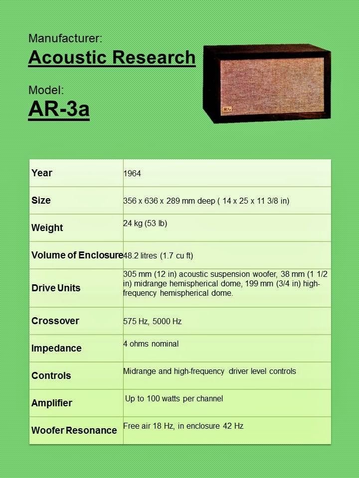 As AR-3a, lançadas em 1964, são o quarto modelo de caixas acústicas da empresa americana Acoustic Research – um aperfeiçoamento do modelo AR-3, lançado em 1957. São caixas compactas – tipo bookshelf ‘grandes’ – de três vias com woofer cone de 12 polegadas, e os primeiros médios e tweeters de domo de tecido que existiram. E foram revolucionárias, para a época, devido à qualidade dos médios e tweeters, voltados à audiofilia – e por serem as primeiras caixas cujos woofers eram para suspensão acústica – que traziam baixa sensibilidade, mas podiam obter melhor resposta de graves, com menos distorção, ao usar suspensões mais leves e moles em gabinetes menores, selados.