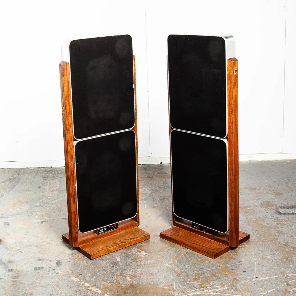 O segundo par que ouvi, foi o modelo maior, com aproximadamente 1.3 metro de altura, que era de duas vias – ou seja, havia um diafragma retangular menor, com seu próprio excitador, para os agudos. Estas tinham agudos decentes, médios bonitos, e graves em quantidade razoável se você, mas mantivesse em um volume mediano (e provavelmente com o controle tonal ativado). Ao sentar-se para ouvi-las, já fui alertado “não aumente o volume, porque elas não aguentam muito”.