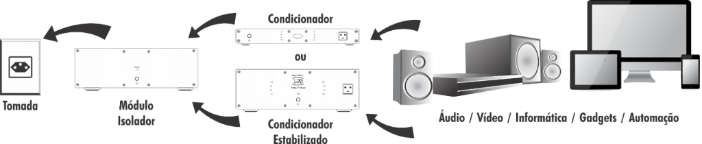 O uso generalizado da energia elétrica, elevou a consciência sobre a qualidade do fornecimento e seus efeitos. Cada vez mais os aparelhos são ‘dirigidos’ por microprocessadores altamente velozes e altamente sensíveis aos distúrbios presentes na rede elétrica. Sabemos que se dispõe de soluções econômicas para limitar ou eliminar os efeitos da má qualidade da energia elétrica mas, essas soluções têm que ser dedicadas e especificamente projetadas para o fim a que se destinam. Equipamentos de áudio & vídeo nos impõe, no projeto, características diferentes dos de informática que, por sua vez, requerem especificações diferentes dos eletrodomésticos e assim sucessivamente – então cada segmento requer um ‘Guardião’ treinado especificamente para cada batalha que se apresenta, ou seja, o tratamento de energia requerido varia conforme o equipamento a ser alimentado. É o caso dos filtros, estabilizadores e transformadores de tensão que, no caso de áudio & vídeo, têm que ser especificamente projetados para esta aplicação sob pena de comprometerem a coloração do som e imagem, o equilíbrio tonal, o corpo harmônico, entre outros prejuízos. Esse ‘Guardião’, no caso do som e da imagem, se chama Condicionador Estabilizado de Energia, que tem seu funcionamento capaz de tratar a rede elétrica, estabilizando, eliminando ruídos, ondas eletromagnéticas e cujo funcionamento seja transparente, neutro e que traga vantagens sonoras e visuais, ou seja, que proporcione significativa melhora do áudio e do vídeo. Como radiografia básica do Condicionador, destacamos: