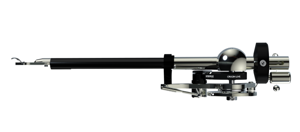 “O tubo do braço é composto de seis materiais para uma melhor qualidade na dissipação de energia e maior rigidez no braço. Com isso se conseguiu: maior transparência, dinâmica e desempenho. O rolamento de pivô duplo de ultra baixa fricção proporciona maior clareza e agudos ultra estendidos, naturais e precisos. Os rolamentos verticais flutuantes desacoplam o tubo do braço e evitam que o braço acrescente coloração ao som captado pela cápsula. O desacoplamento de pivô duplo sofisticado do Enterprise, incorporou várias camadas adicionais de isolamento nos rolamentos verticais, o que produz níveis mais baixos de coloração, permitindo muito maior inteligibilidade na micro dinâmica. O shell é feito de um composto de metais proprietário da Origin Live. O cabo interno do braço Linear Flow 2, fabricado pela Origin Live, para perda mínima de sinal, resultando em maior fidelidade recebida na cápsula e entregue ao pré de phono. Este cabo é totalmente balanceado e 95% blindado. Os plugues phono são WBT nextgen RCA de cobre puro. É notória a preocupação dada no projeto do rolamento de pivô duplo de baixo atrito totalmente estável, para movimento vertical – para isso ele utiliza duas pontas simples de carboneto de tungstênio em copos endurecidos com uma resina especial, amplamente espaçados para imitar a estabilidade do rolamento cardan, mas sem o atrito deste. Os rolamentos para o movimento horizontal são especificados para o mínimo de atrito.”