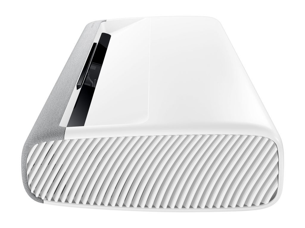 Além dos alto-falantes revestidos de tecido na frente, as únicas outras características visíveis são um slot na parte superior, onde a lente está localizada, e entradas e saídas de ar em ambos os lados. A lente projeta para trás em direção à parede e há um recurso de segurança chamado “Modo de proteção ocular” que atenua automaticamente a intensidade da luz do projetor se você bloquear o feixe luminoso.