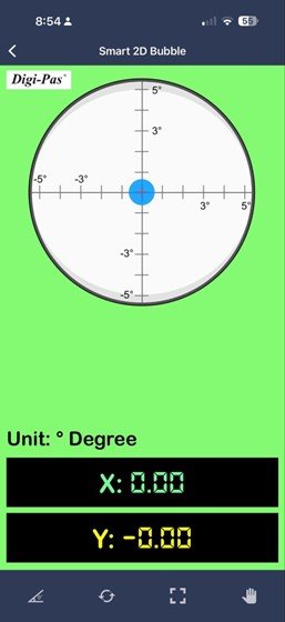 Adquira essa Ferramenta – invista no nível DWL90Pro mini cube da Digi-Pas – uma ferramenta de nivelamento de aproximadamente US$ 49, que mede com precisão de ± 0,1° de 0° a 1°, e ± 0,2° de 1° a 89. Uma ótima maneira de atingir um nivelamento aceitável. Acompanha certificado e também pode ser calibrada com uma superfície nivelada conhecida. A principal vantagem é a aplicação, que permite ajustar o nível no topo de uma estrutura e visualizar os efeitos dos ajustes enquanto se trabalha na parte inferior, onde os pés ajustáveis provavelmente estarão localizados.