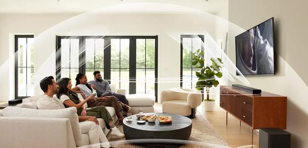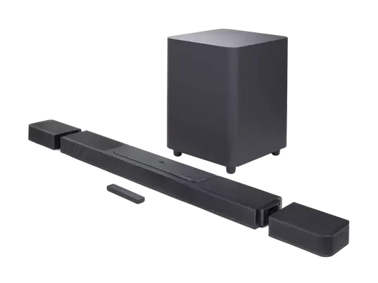 A soundbar oferece um sistema completo, com MultiBeam e 15 canais com seis drivers com saída de som voltada para cima, quatro na barra e dois nos alto-falantes surround removíveis alimentados por bateria de até 12 horas, e um subwoofer de 12 polegadas. São 585 W RMS de potência total com Dolby Atmos e DTS:X trazendo surround 3D aprimorado.