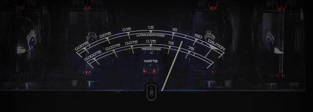 O segundo botão é para o usuário regular a intensidade de luz do VU, em três níveis de iluminação ou desligado. E o quarto botão alterna entre os modos Ultralinear (150 W por canal) ou Triode (75 W por canal). No Ultralinear o LED é verde e no Triode o LED passa para azul.