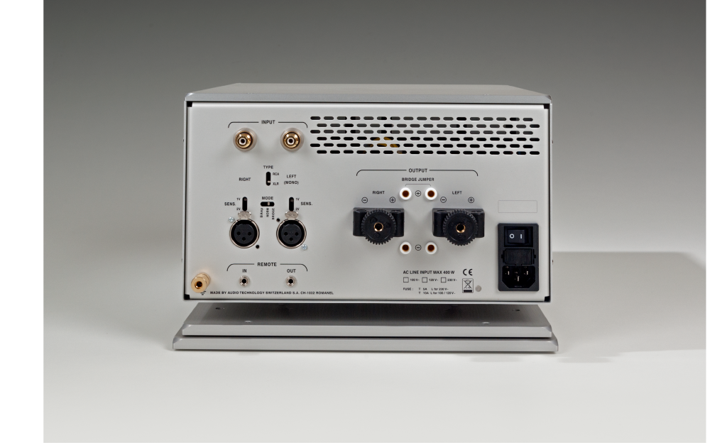 No painel traseiro temos, da direita para esquerda: tomada IEC, caixa de suporte de fusível, terminais de caixas da Cardas (versão Rhodium) e duplos terminais de caixa tipo banana, também para serem usados para acomodar o jumper de ponte paralela para uso em mono. Na seção input estão disponíveis conectores XLR e RCA, ajuste por chave de sensibilidade de 1 ou 2V RMS, e chaves para seleção de modo estéreo, normal, ponte ou bi-amplicação (mono duplo). A seção remota permite, no modo automático, que os amplificadores estejam interligados a um sistema de automação (cabo jack de 3,5 mm).