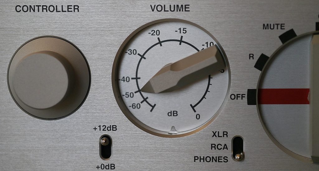Do lado esquerdo do painel frontal temos o famoso Modulômetro Nagra, que mostra o nível de saída dos dois canais, depois temos o seletor de entradas, uma chave de ganho de 0 e 12 dBs, potenciômetro de volume, chave que seleciona fone de ouvido, saída RCA ou XLR, e botão de desliga, mute e liga.