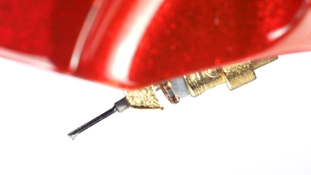 Então, aos que depois de lerem este teste se interessem, basta um braço comum de massa média e a Hana Umami Red se sentirá à vontade. Quanto aos prés de phono, sua baixa resistência interna de 06 Ohms pode perfeitamente trabalhar com qualquer bom pré de phono com impedância acima de 100 Ohms. Sua força de rastreamento, para uma alta precisão de leitura dos sulcos, é de 2.0 g, com tensão de saída de 0,4 mV. Sua agulha é um diamante com um corte Microline, um cantilever de boro rígido, porém muito leve, que tem o objetivo de dissipar suas vibrações para o próprio cartucho. Os quatro pinos para a ligação da cápsula à fiação do braço são folheados a ouro 24 quilates, que estão fixados em uma placa de poliéster.