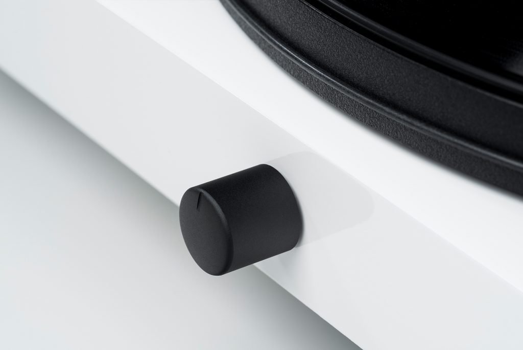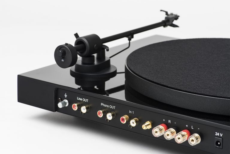 Começando pelo toca-discos, este é montado em uma base de MDF com acabamento em laca, em três cores: preta, branca ou vermelha. O prato, de compensado de madeira, tem tapete de feltro e a tração é feita por correia com velocidades de 33 e 45 RPM ajustados na polia. O braço de 8,6 polegadas, feito em alumínio, calçado com uma cápsula OM5e da Ortofon, completa o conjunto elevando a qualidade geral do aparelho. Todos os ajustes estão pré-configurados de fábrica, inclusive anti-skating – preocupação zero na hora da montagem. Dentro da embalagem, além da tampa acrílica, também acompanha a fonte de 12V.