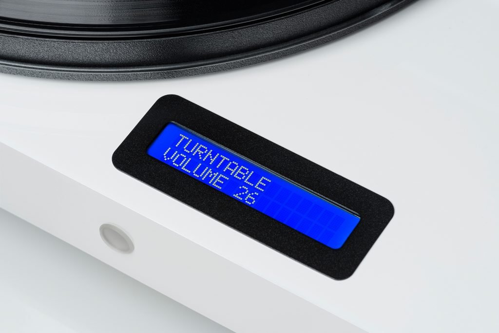 Entre o braço e o prato está uma tela de cristal líquido com informações da seleção entre toca-discos, Bluetooth e entrada Direta.