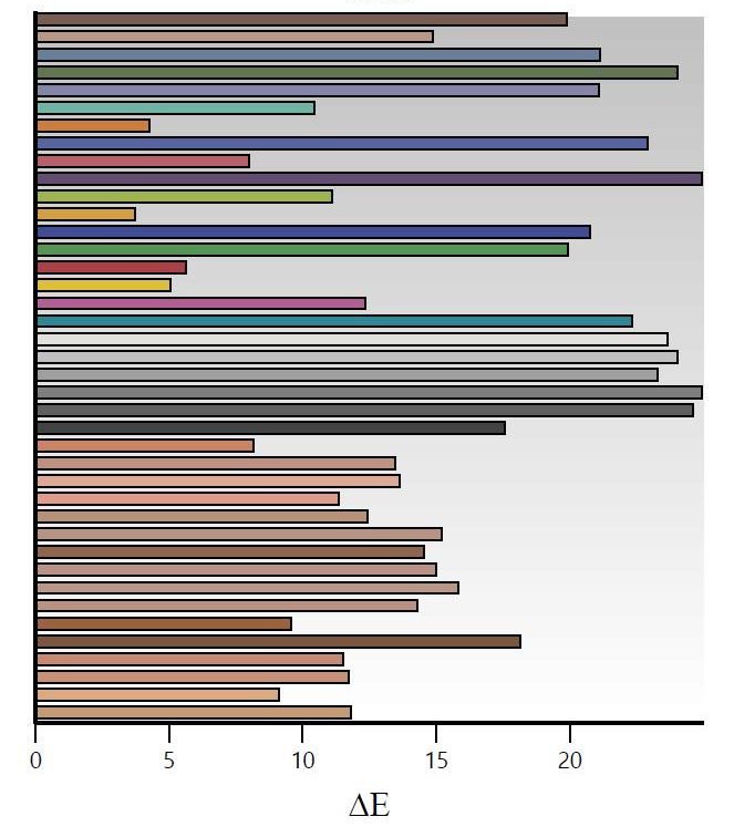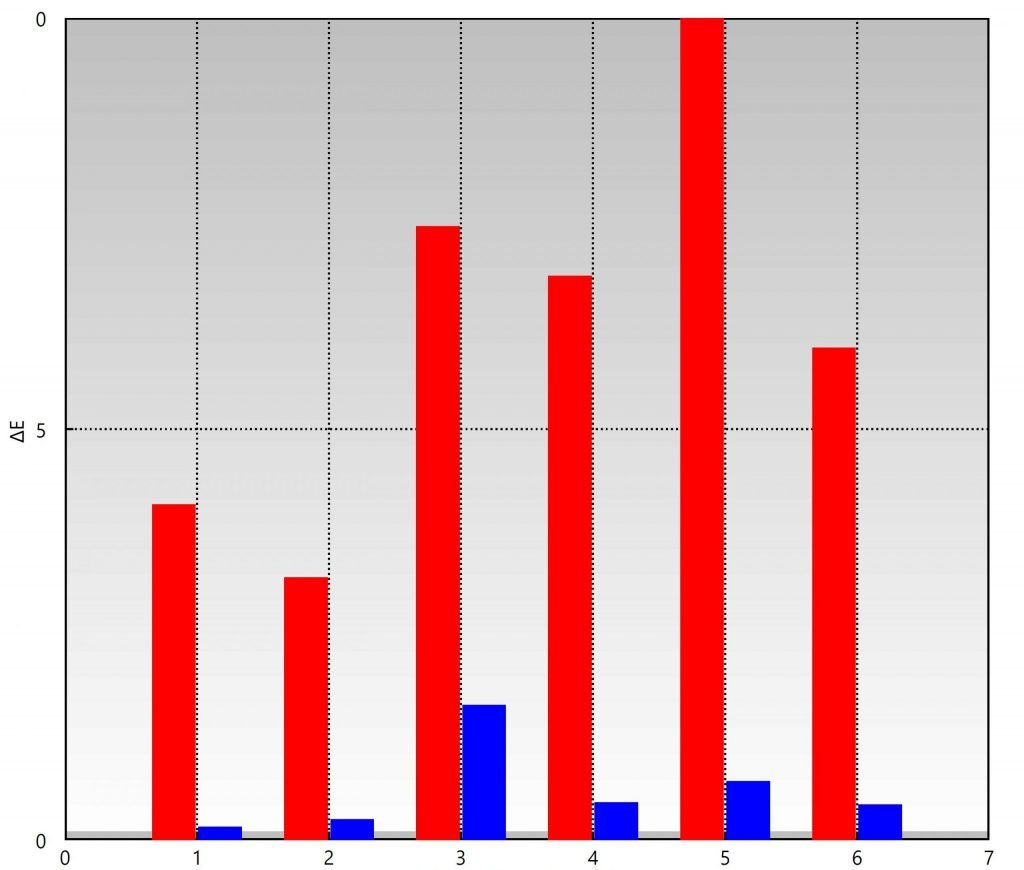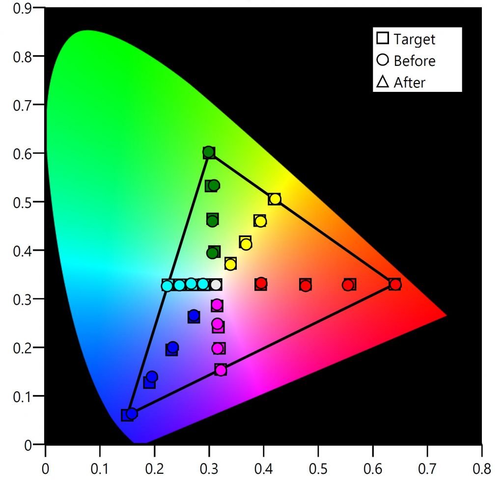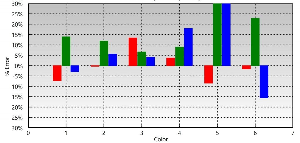 As cores apresentaram extrema saturação de azul (B) e baixa saturação de vermelho (R) e de verde (G). Essa diferença foi corrigida na calibração utilizando os controles avançados de cores da TV. O dE médio inicial foi de 11.5 e após a calibração obtivemos dE 0.5, excelente resultado cromático.