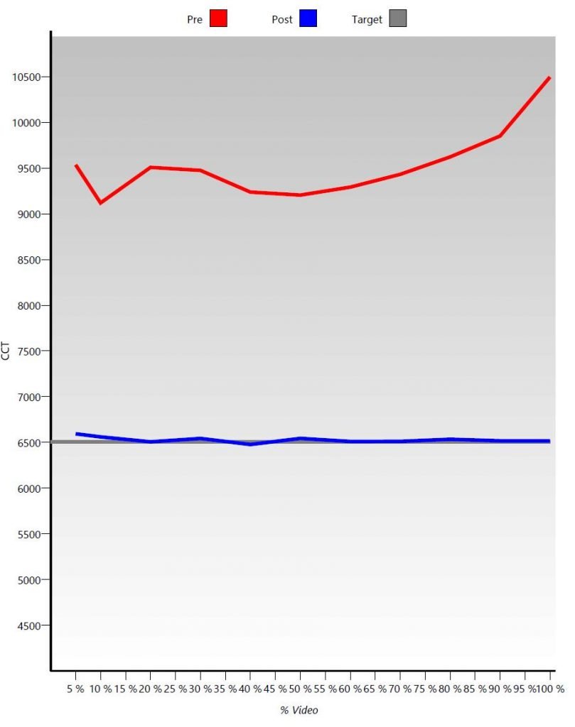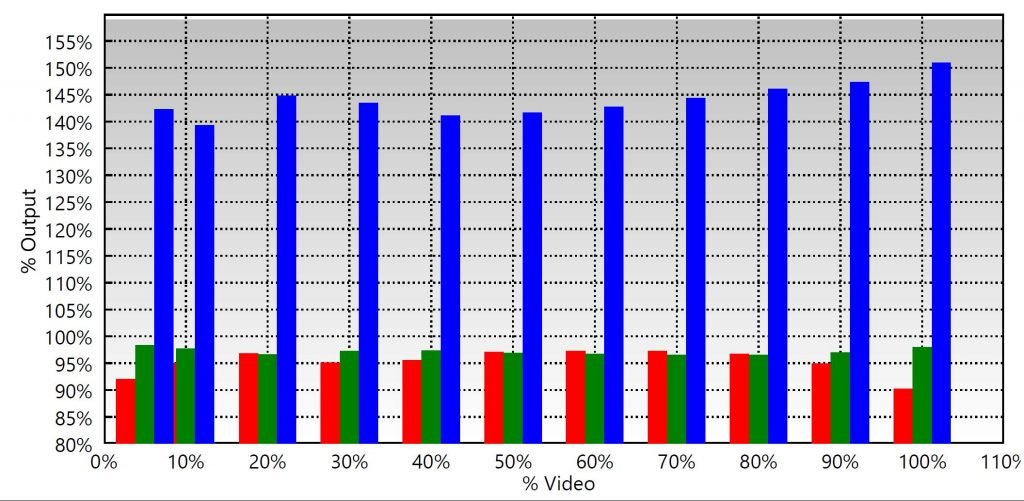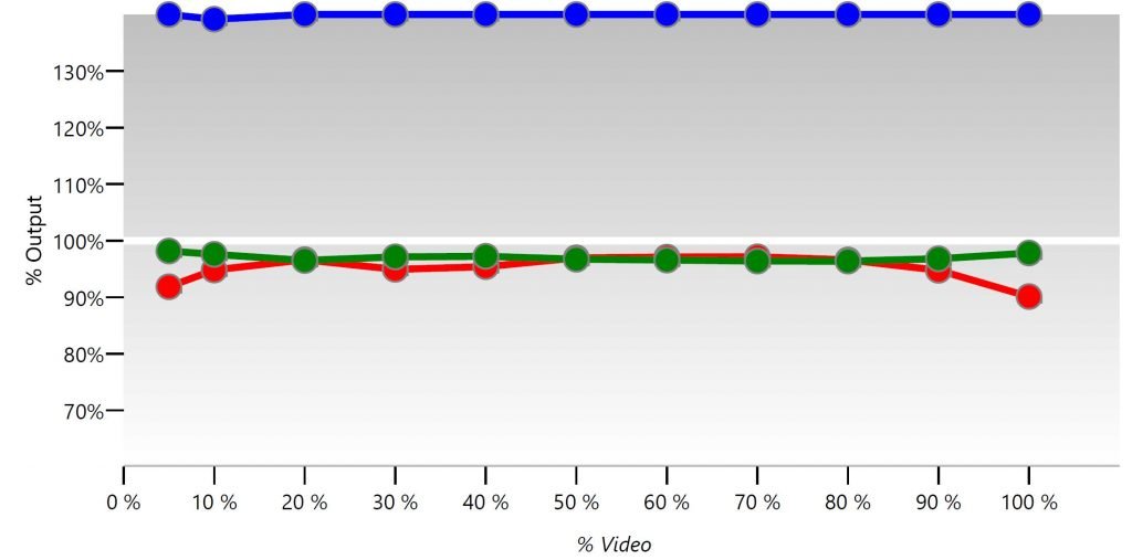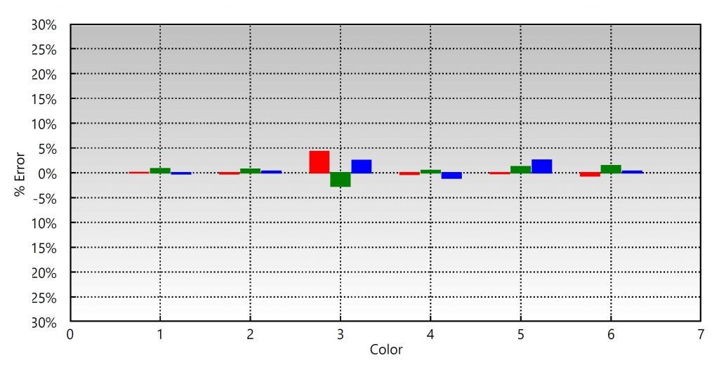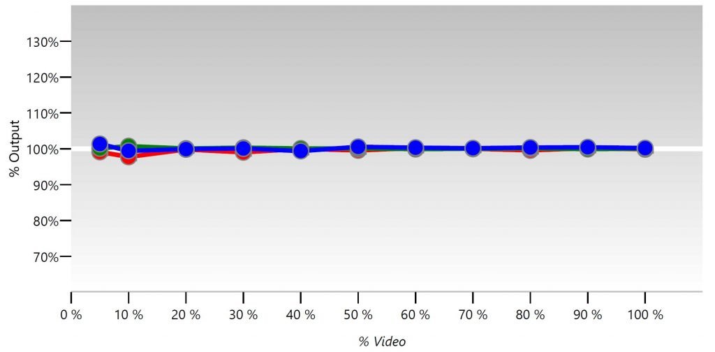 Nas medições pré-calibração, o dE médio foi 24.1, e o maior dE individual de 26.8 (Delta E é uma expressão que indica quão próximo do branco ideal D65 o resultado se encontra – abaixo de 3 é considerado visualmente indistinguível do resultado ideal). Após a calibração obtivemos um dE médio de 0.4, excepcional resultado demonstrando excelente linearidade na escala de tons de cinza.