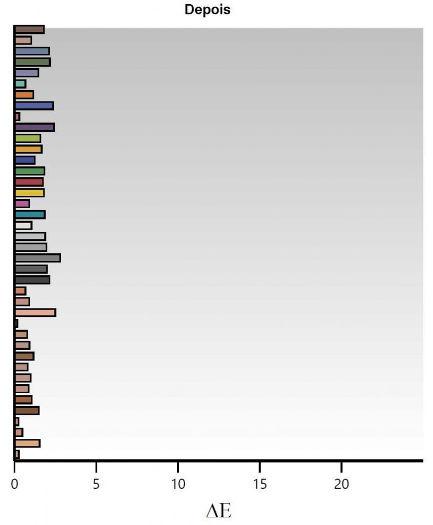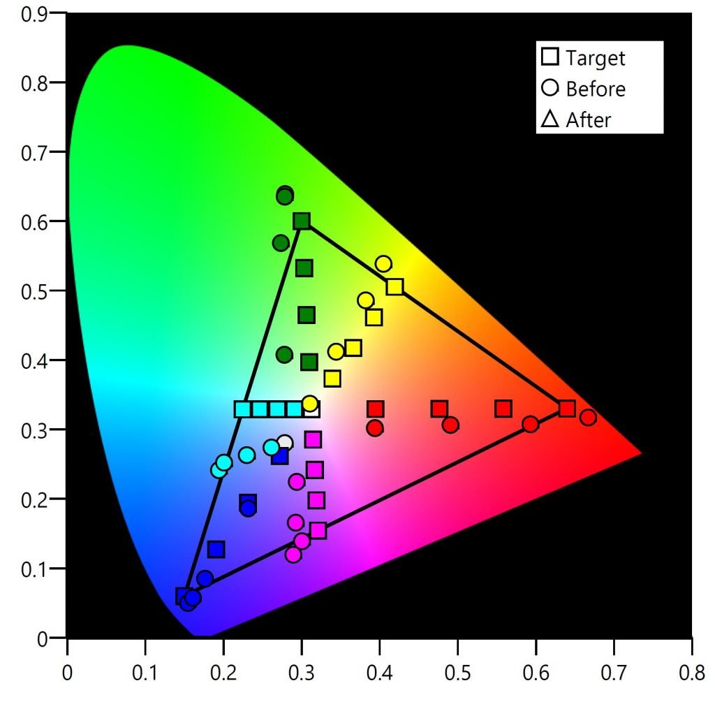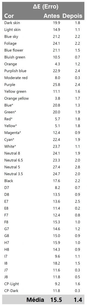 O resultado cromático pós-calibração foi excelente, apresentando excelente linearidade das cores primárias e secundárias em toda a escala de saturações.