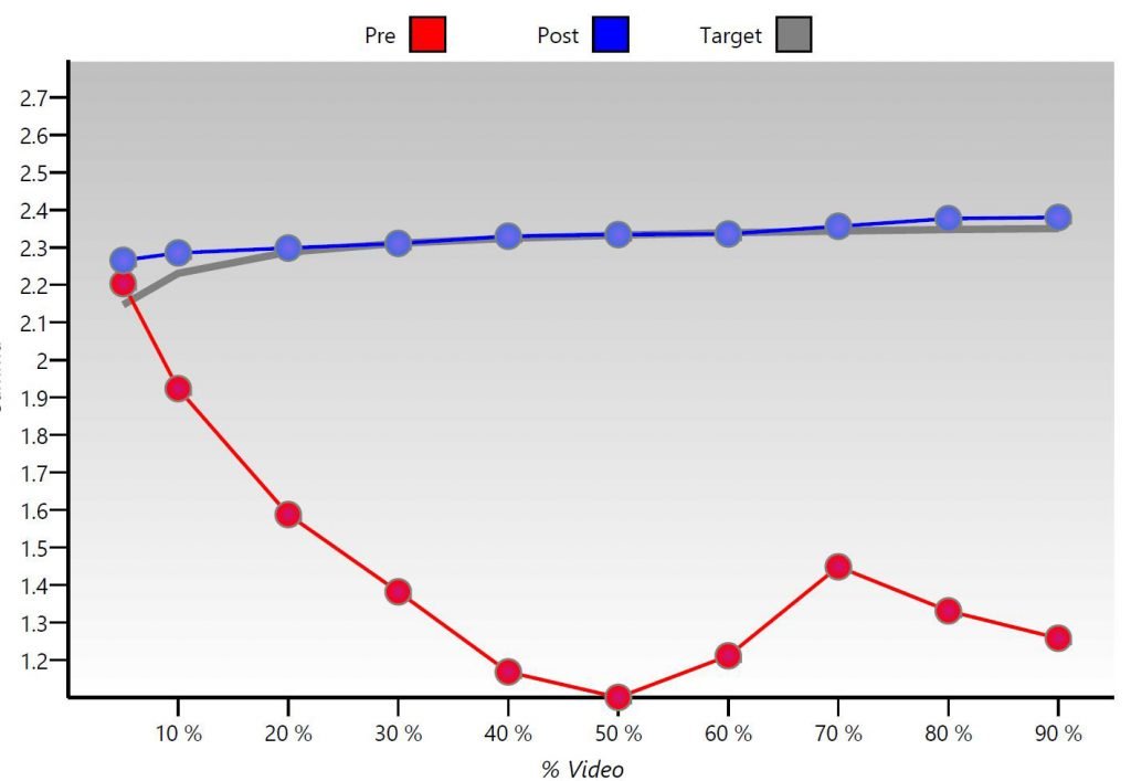 A curva de Gamma inicial estava muito baixa, com valor médio de 1.46. Fizemos ajustes utilizando o menu com ajuste em 20 etapas, buscando seguir o padrão BT1886. As medições pós-calibração apresentaram Gamma médio de 2.33 com valores muito bons em todos os níveis de estímulo (10% a 90%) e excepcional linearidade.