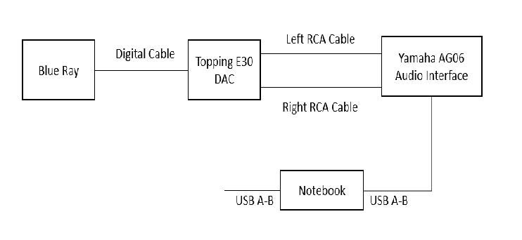 Para investigar possíveis discrepâncias, foi desenvolvida uma configuração composta por um Blu-Ray Sony BDP — S480, que reproduz 41 sinais senoidais em frequências entre 20 Hz e 20 kHz. Ele foi conectado a um DAC (Conversor Digital Analógico) Topping E30 através do cabo digital, e do DAC à interface de áudio Yamaha AG06, através de cabos RCA, destinados ao estudo. Os sinais analógicos são gravados com uma taxa de amostragem de 192 kHz e com 24 bits de quantização. A interface de áudio foi conectada a um notebook Avell através de um cabo USB A-B, e os 41 sinais foram gravados com o software Audacity para o computador. Uma segunda gravação foi feita a partir de um vídeo do YouTube, tendo o notebook como fonte e o sinal de áudio decodificado de digital para analógico no Topping E30. A Figura 1 mostra um esquema da conexão do equipamento.