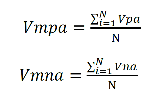 Sendo N o número de pontos positivos máximos, Vpa, ou pontos negativos mínimos, Vna, encontrados no conjunto de cada uma das 41 frequências. O valor de N varia dependendo da frequência do sinal. Para cada frequência, o sinal dura 30 segundos. Assim, por exemplo, para uma frequência de 20 Hz. Em termos de N= 30 × 20 = 600 pontos. Para outras frequências, o número de picos varia. Com estes valores máximos de pico de tensão, espera-se encontrar uma diferença nos valores médios para cada cabo, em cada uma das 41 frequências.