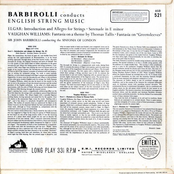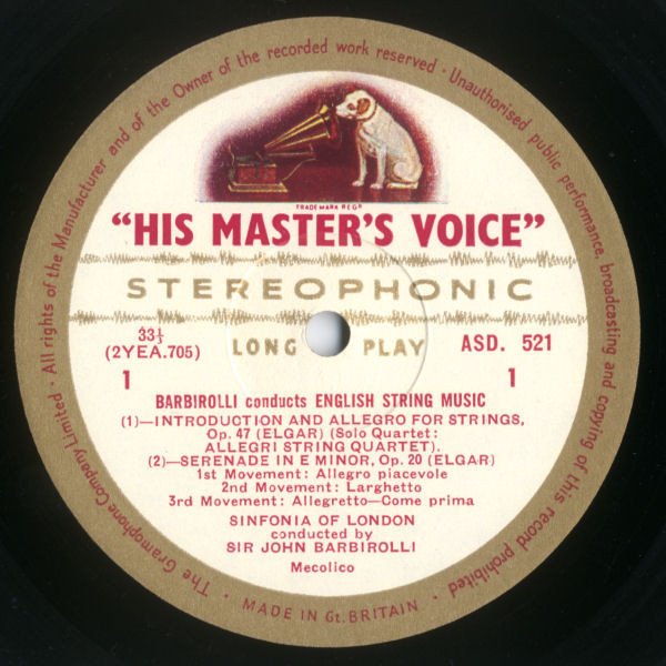 Sir John Barbirolli foi um dos grandes regentes britânicos de todos os tempos, e um LP importado de boa estirpe His Master’s Voice é algo que não se deixa passar – ainda que música para orquestra de cordas possa não ser do maior interesse de todos, sendo frequentemente melhor que melatonina para promover um sadio e profundo sono.