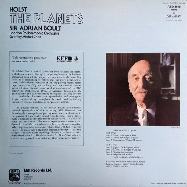 Esta específica gravação da suíte orquestral The Planets, do compositor inglês Gustav Holst, é ‘audiófila’ porque foi financiada e supervisionada tecnicamente pela célebre fabricante inglesa de caixas acústicas, KEF. Tanto que leva o logotipo da empresa estampado da capa e contracapa, além de um texto sobre eles homenagearem a longa e altamente representativa carreira de um dos maiores regentes ingleses, Adrian Boult – que regeu esta específica gravação com 90 anos de idade! O resultado é uma excelente gravação e uma referência para os audiófilos britânicos há muitas décadas.